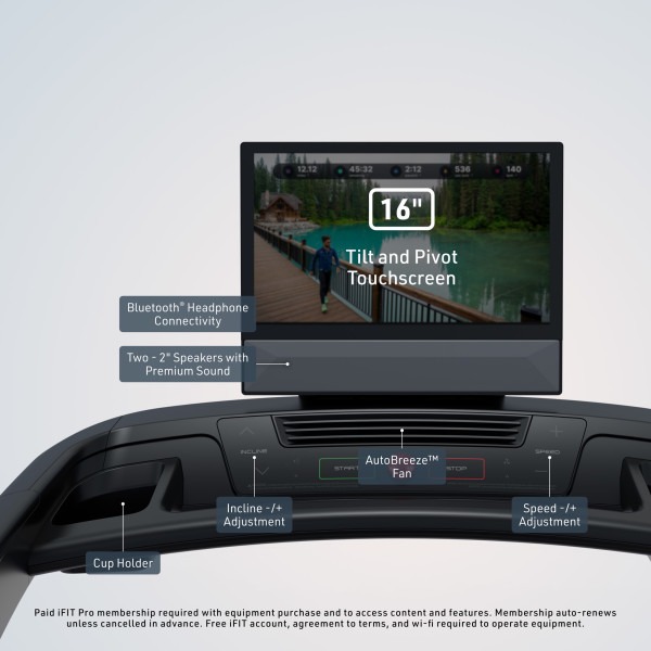 Il display LCD da 16 pollici, integrato in una console moderna con unità in vetro, consente di visualizzare chiaramente tutti i dati di allenamento. Le informazioni sono organizzate in modo intuitivo, garantendo controllo totale sulla sessione. Inoltre, il tapis roulant è compatibile con iFIT Pro (abbonamento acquistabile separatamente), che offre accesso a allenamenti interattivi e guidati, mantenendo alta la motivazione.