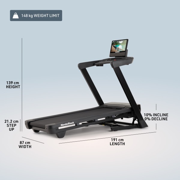La superficie di corsa ampia, 152 x 51 cm, è studiata per garantire stabilità e sicurezza anche agli utenti con falcata lunga, offrendo una sensazione di corsa naturale e confortevole. La struttura robusta supporta un peso fino a 148 kg, confermando l’elevata solidità del telaio e la qualità costruttiva del marchio NordicTrack.