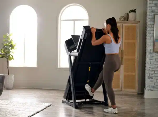 Dopo aver terminato la sessione, entra in azione il design SpaceSaver. Con un semplice sollevamento del nastro del tapis roulant e il bloccaggio con il perno dedicato, il tapis roulant si ripiega in modo semplice, liberando spazio prezioso nell’ambiente domestico.
