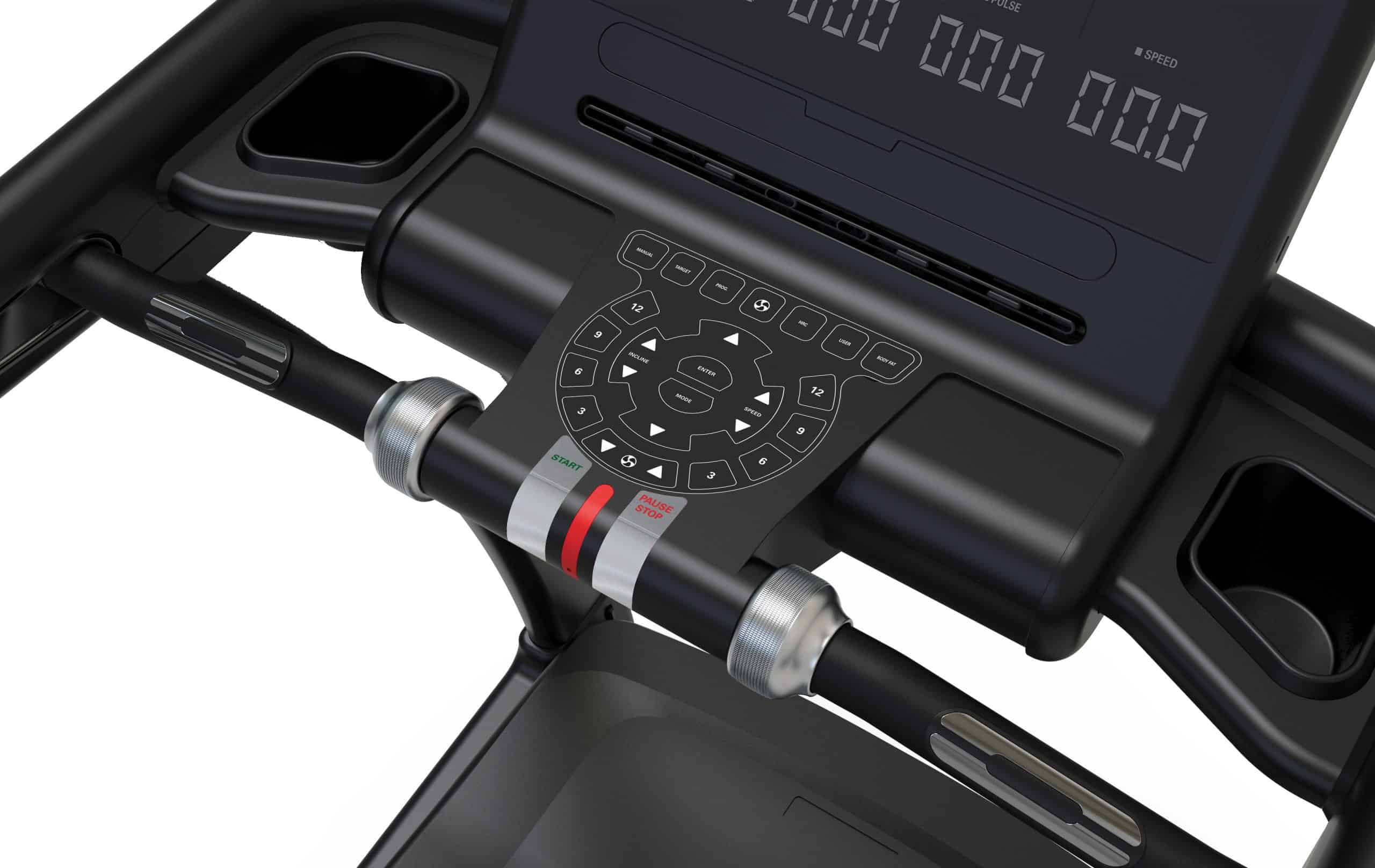 La console è composta da 6 display LED bianchi + 1 display aggiuntivo che mostrano velocità, tempo, distanza, calorie, inclinazione e programma in uso. Il battito cardiaco si rileva tramite sensori palmari hand pulse o con fascia cardio inclusa. È presente un pratico supporto per tablet e smartphone.